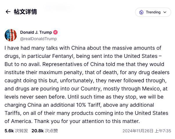 當(dāng)前位置:雄達(dá)國(guó)際物流公司 - 資訊中心 - 行業(yè)新聞 - 突發(fā)!特朗普聲稱對(duì)中國(guó)加征關(guān)稅10%-雄達(dá)國(guó)際物流導(dǎo)讀: 據(jù)新聞客戶端消息,當(dāng)?shù)貢r(shí)間11月25日,特朗普在其社交媒體賬號(hào)發(fā)表了兩條推文,都是針對(duì)加征關(guān)稅的決定。 特朗普表示,將對(duì)墨西哥和加拿大進(jìn)入美國(guó)的所有產(chǎn)品征收25%關(guān)稅。此外,特朗普還宣布將對(duì)中國(guó)商品額外征收1...