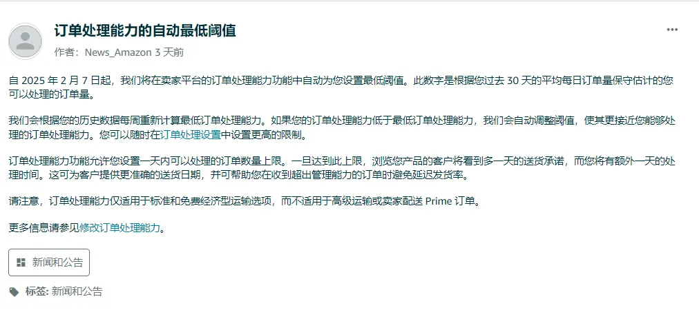 除了DOE政策更新外,亞馬遜還于2025年2月24日實(shí)施了另一項(xiàng)新政——訂單處理設(shè)置閾值。該政策旨在幫助賣家更準(zhǔn)確地管理訂單處理能力,同時(shí)為消費(fèi)者提供更可靠的配送時(shí)間預(yù)估。